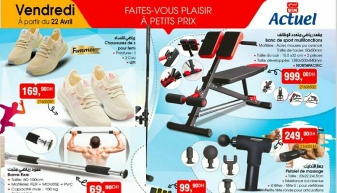 Découvrez les nouvelles promotions et solde du Catalogue Bim 22 avril. Et Maintenez votre forme grâce à l’offre sportive de BIM, dans tous les magasins BIM à partir du Vendredi 15 avril. Cette offre contient: Vélo elliptique dynamic prix 1499 dh. Banc de sport multi-fonctions northpacific prix 999 dh. Chaussures de sport pour hommes prix 169 dh. Chaussures de sport pour femmes prix 170 dh. Tapis de gym pila le prix 119 dh. Barre fixe prix 70 dh. Ballon de gym avec bandes extensibles prix 120 dh. Pistolet de massage prix 249 dh.