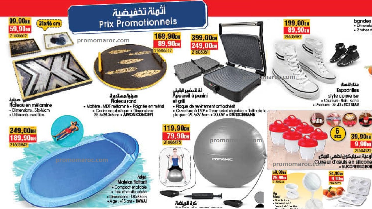 Appareil a panini et grill deutschman 249dhs au lieu de 399dhs. Matlelas flottant Hawaï 190dh. Ballon de gym avec bande extensible 80dh. Porte bijoux 40dh. Plateaux rand 90 dh au lieu de 170dh.