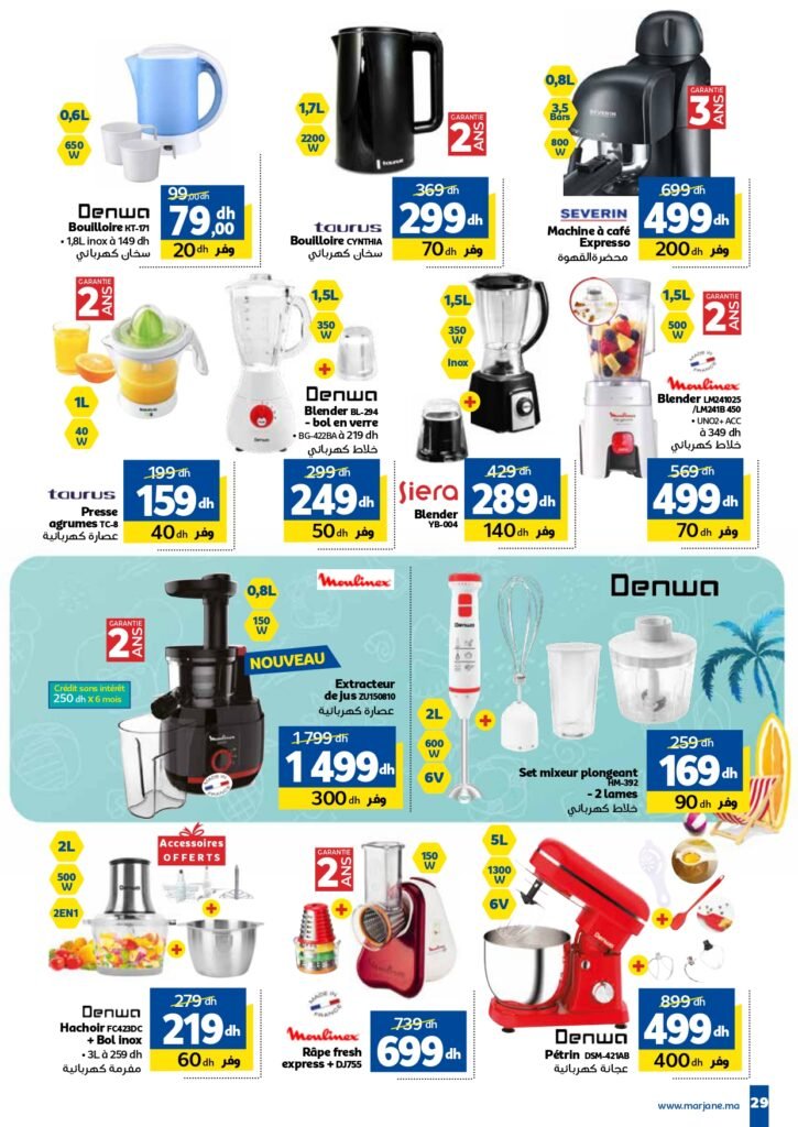Réfrigérateur combiné LG 6199dh. Four électrique taurus avec blender offrrt 2299dh. Friteuse électrique severin 1999dhs. Glacière 179dh. Valise abs Athènes prix 219dh. Smartphone zte nubia 1990dh. Samsung s24 ultra 16990dh. Smart TV samsung 50p 5199dhs. TV mgs fhd framless 43p prix 2799dh.