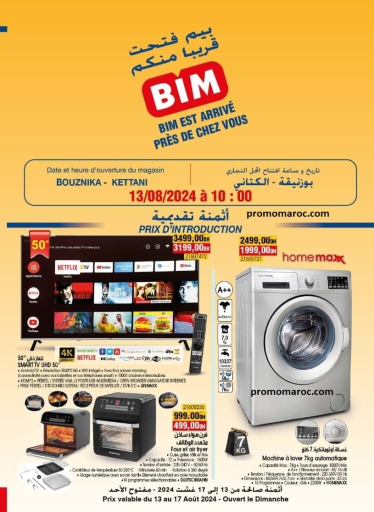 Cette offre desponible dans vous magasin bim nouvelle ouverture dans la ville Bouznika du 13 au 17 Août 2024.