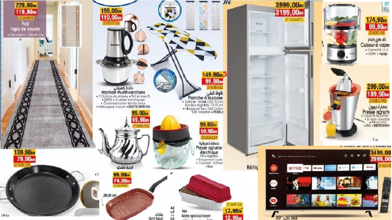 Réfrigérateur combiné 2 portes homemaxx 3199dh au lieu de 3999dh. Smart TV LIFEMAXX uhd 50p 2999dhs. Cuiseur a vapeur 100dh. Presse agrumes 190dh. Tapis de couloir 120 dh. Hachoir multifonction deutschman 120dh. Théière 70dh. Caméra ip kiwi 50dh. Poulet a paella 80dh.