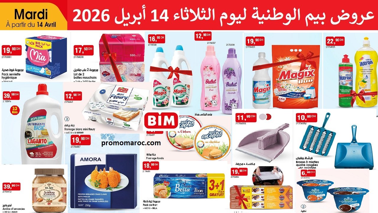 AccueilsupermarchéBimPromotion Bim mardi 14 avril 202612 avril 2026FacebookXPinterestWhatsApp Promotion Bim mardi 14 avril 2026Découvrez les nouvelles promotion et solde Bim mardi 14 avril 2026. disponible dans tous vos magasins bim au Maroc. Le catalogue bim 14 avril 2026 met a votre disposition:TagsBIM MarocCatalogue BimPromotion bimPartagerFacebookXPinterestWhatsApp Articles Liés kazyonSoldes Kazyon du 13 au 15 avril 2026 BimCatalogue Bim maroc 17 avril 2026 BimCatalogue Bim 17 avril 2026Articles récents kazyonSoldes Kazyon du 13 au 15 avril 2026 BimCatalogue Bim maroc 17 avril 2026 BimCatalogue Bim 17 avril 2026 BimCatalogue Bim vendredi 17 avril 2026 kazyonCatalogue Kazyon du 16 au 22 avril 2026Voir plus