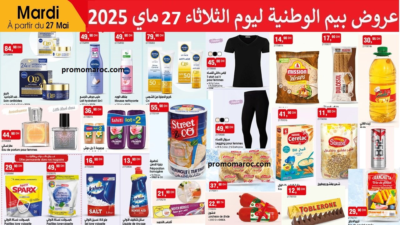 Découvrez les nouvelles promotions et solde bim mardi 27 Mai 2025. Parfums, produits alimentaires, produits d’entretien et bien d’autres bonnes affaires vous attendent uniquement chez BIM. disponible dans tous vos magasins bim au Maroc.