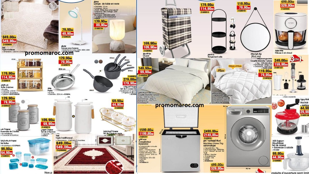 Congélateur horizontal marque homemaxx capacité 100 litres prix bim 1199dh au lieu de 1599dhs. Machine à laver 7kg automatique marque homemaxx prix Bim 2149dh au lieu de 2499dh. Friteuse à air chaud bol en verre marque afos prix bim maroc 329dh au lieu de 499dh. Set de mixeur plongeant 3en1 marque deutschman prix bim 329dh au lieu de 499dh. Lampe pour bureau prix bim market 50dh au lieu de 80dh. Couette blanche 2 places prix bim 80dh au lieu de 120dh.