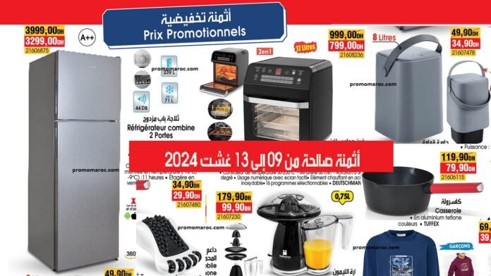 Réfrigérateur combiné 2 portes homemaxx 3299dh au lieu de 3999dh. Four et air fryer deutschman 12 litre 799dh au lieu de 999dh. Support mobile pour téléphone 50dh. Presse agrumes 70dh. Casserole 80dh. Poubelle 35dh. Mini apparaeil de massage électrique pour pieds 30dh. Sweat-shirt 40dh.