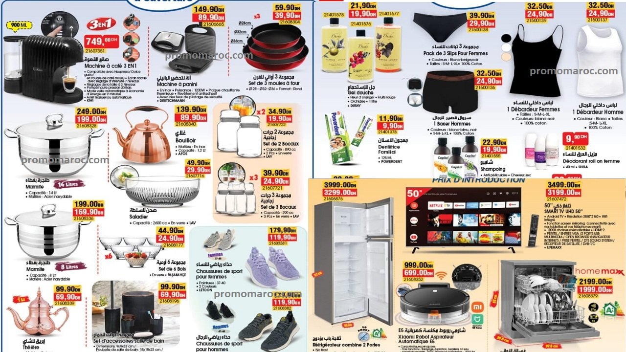 Réfrigérateur combiné 2 portes homemaxx homemaxx 3299dh. Smart TV LIFEMAXX 50p 3199dh. Lave vaisselle homemaxx 1999dh. Xiaomi robot aspirateur automatique E5 699dh. Machine a café 3en1 kiwi 749dh. Machine a panini deutschman 90dh. Set de 3 moules a four 40dh. Bouilloire 90dh. Marmite 170dh. Chaussure de sport 120dh. Théière 70dh.