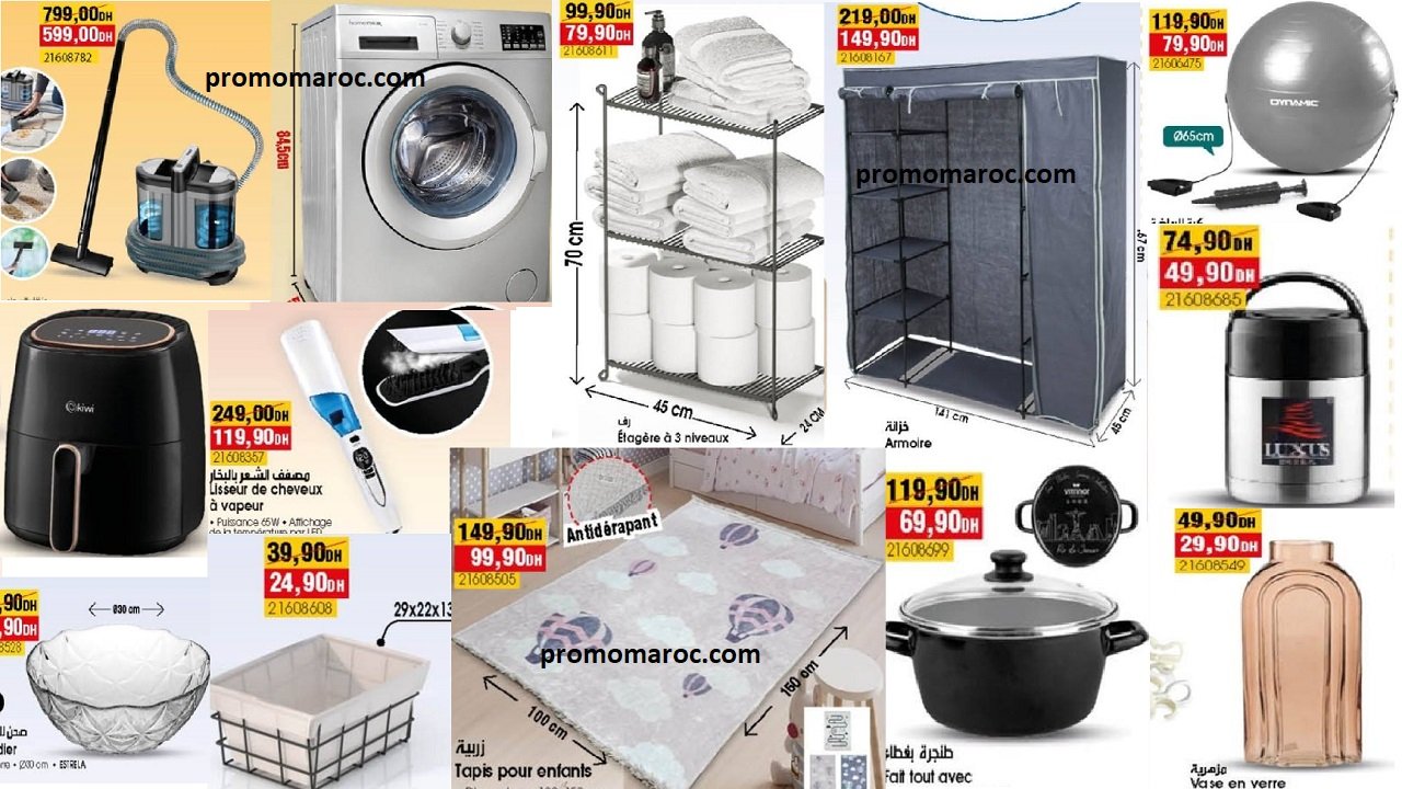 Machine à laver 7kg homemaxx 2499dhs. Nettoyeur de tapis et de sofa 599dh. Lisseur de cheveux à vapeur 120dh. Friteuse électrique sans huile kiwi 499dhs. Étagère à 3 niveau 80dh. Vase en verre 30dh. Saladier 25dh. Coussin rectangulaire 60dh. Pyjama pour femme avec dentelle 70dhs. Armoire 80dh. Tapis pour enfants 100dh. Ballon de gym avec bande extensible 80dh. Porte manger 50dh. Fait tout avec couvercle 70dh.