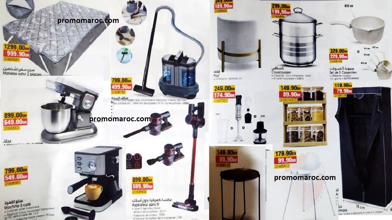 Matelas safyr 2 places prix 1000dhs au lieu de 1299dh. Nettoyeur de tapis et de sofa 499dhs au lieu de 799dh. Robot pétrin de cuisine hofmann prix 649dhs au lieu de 899dh. Aspirateur sans fil deutschman prix 599dhs au lieu de 899dhs. Machine à café deutschman 549dhs au lieu de 799dhs. Armoire 80dh. Chaise haute pour bébé 100dh. Boîte à épices 9 pièces en verre prix 90dh au lieu de 150dh. Set de mixeur plongeant 3en1 deutschman 175dh au lieu de 249dhs. Couscoussier 10 litres 200dhs. Set de 5 casseroles en granite 230dhs.